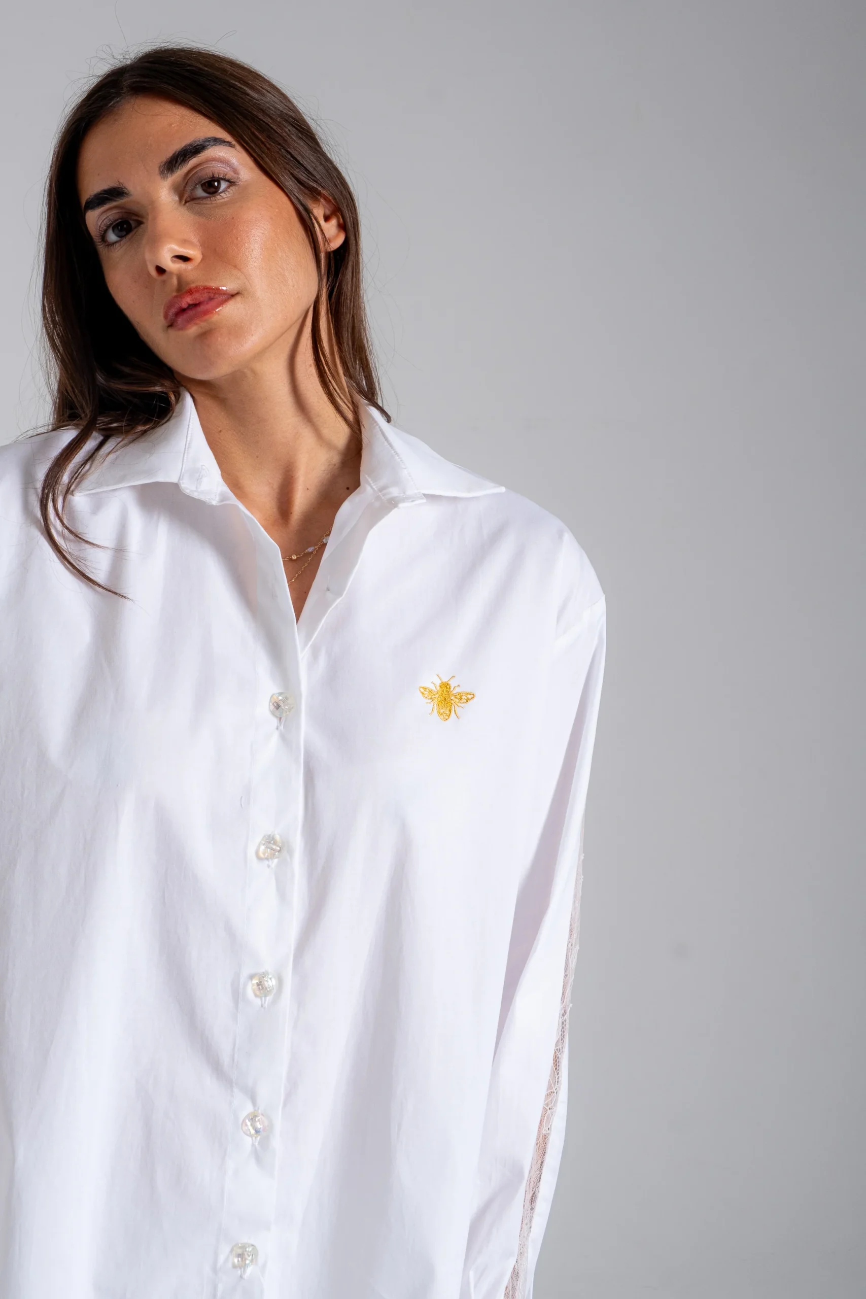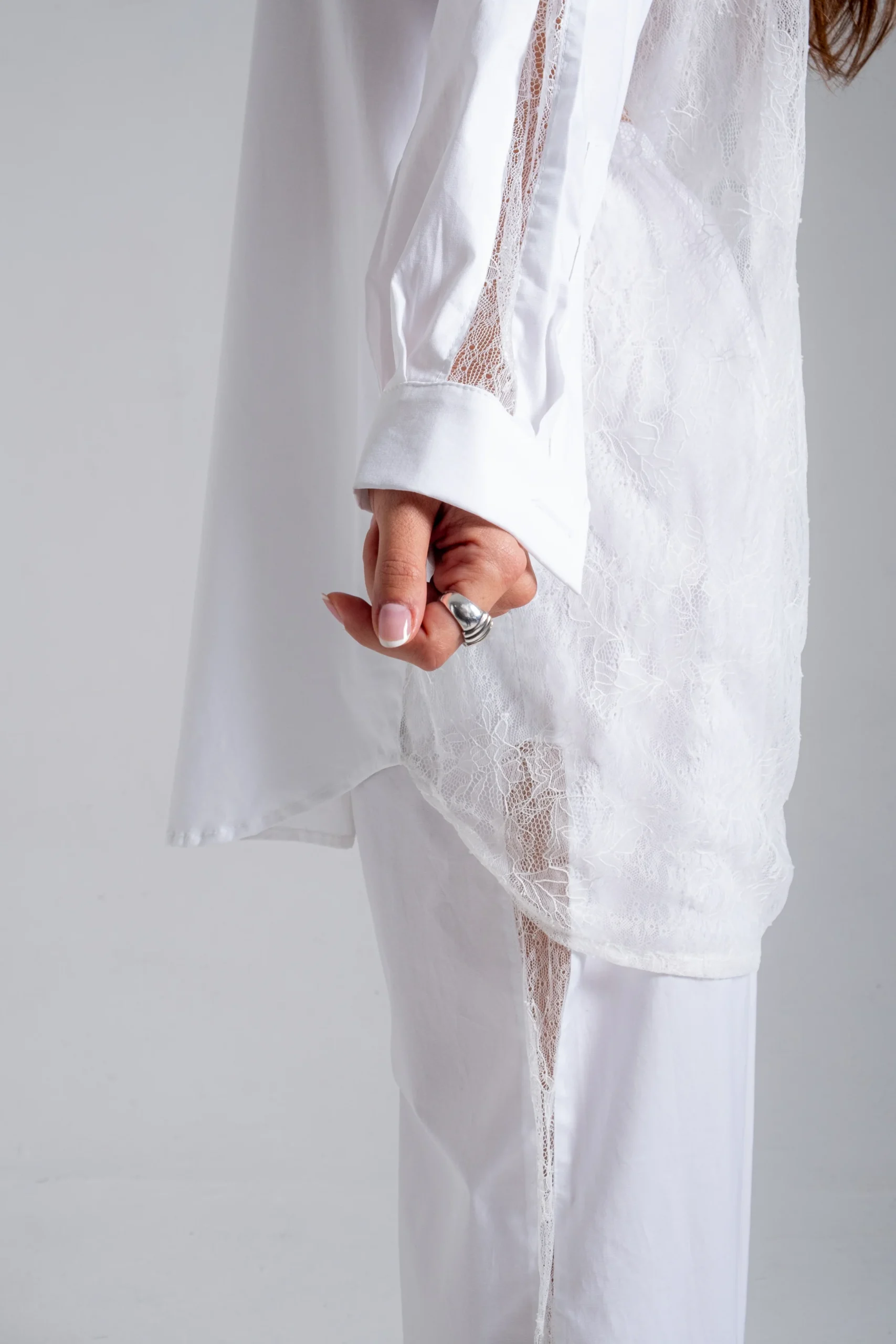 Η δαντέλα τοποθετείται στρατηγικά στα μανίκια και στην πλάτη, προσθέτοντας υφή, ελαφρότητα και μια σύγχρονη αισθησιακή λεπτομέρεια που ανανεώνει το κλασικό λευκό πουκάμισο.